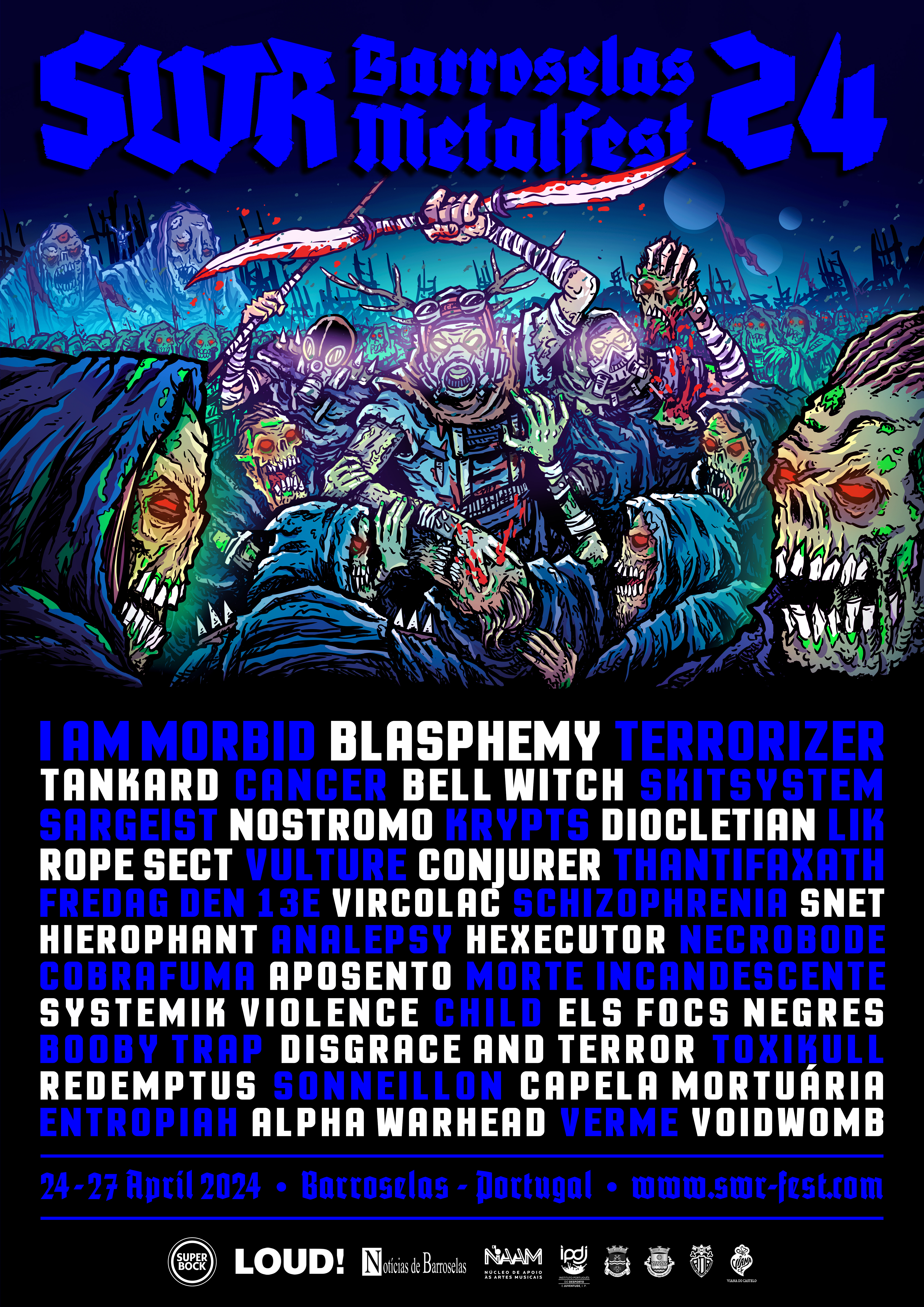 O SWR BARROSELAS METALFEST é um dos festivais de música extrema mais antigos da Europa, ocorrendo sem parar desde 1998. SWR significa Steel Warriors' Rebellion, Barroselas é a sua cidade natal, e Metalfest, você sabe o que isso significa! Localizado desde a primeira edição nesta vila tranquila no noroeste de Portugal, cerca de 80 km ao norte do Porto. O festival possui duas etapas cobertas tocando alternadamente e combinando uma variedade de estilos, um mercado de metal obscuro, área de comida e bebida, café e camping gratuito na floresta. O que é que esta organização adora: "Adoramos bandas ao vivo, ilustrações e as obras de arte sombrias do metal, adoramos compartilhar nova música e novos artistas, adoramos liberdade e companheirismo."